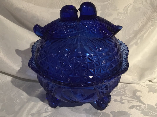 Original Hofbauer Byreds Cobalt Blue Glass 3-Footed Candy Dish w/Love Birds