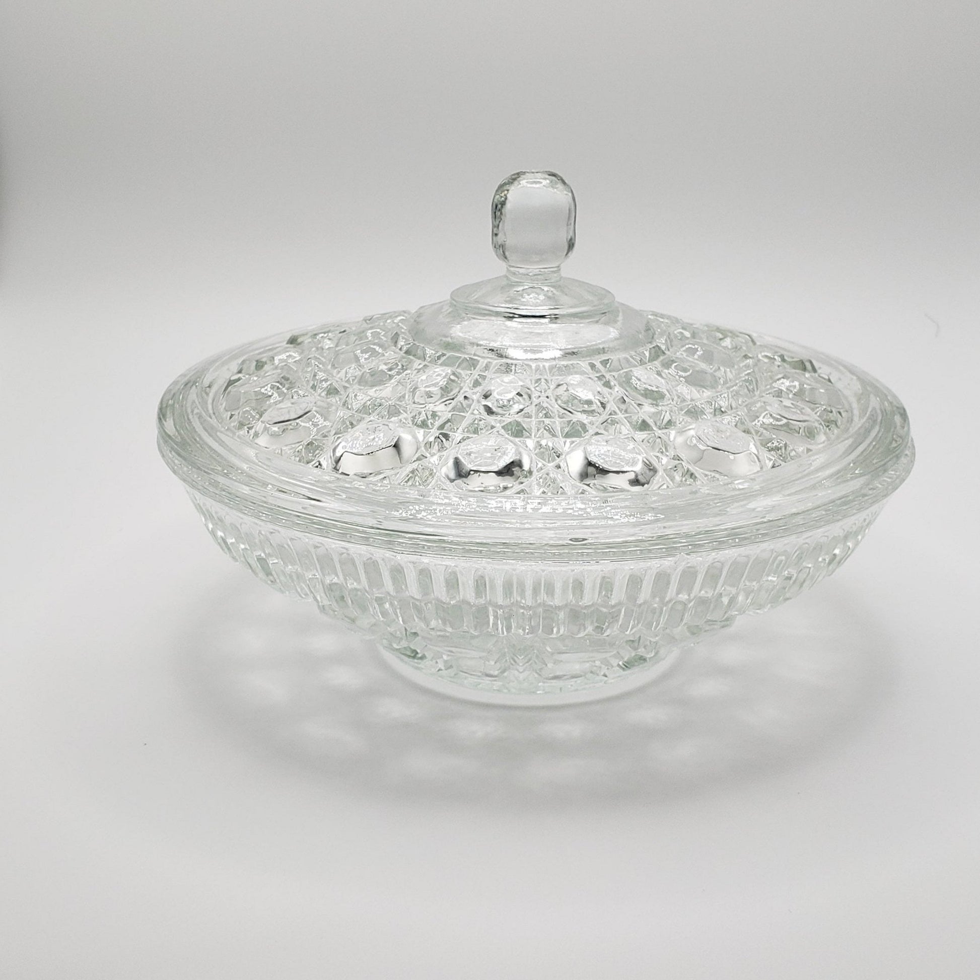This Candy Dish & Lid Windsor Clear, is crafted by Federal Glass. Made with durable clear pressed glass. This dish is perfect for storing your sweet treats while adding a touch of elegance to your space. Showcase your candy collection with this timeless piece.