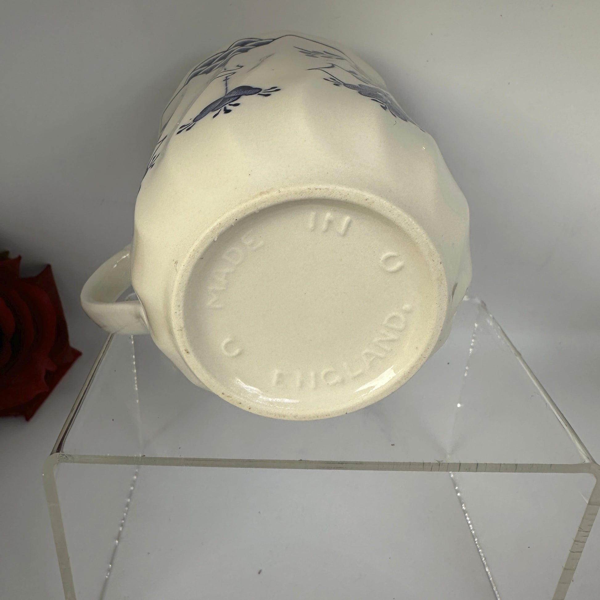 These Finlandia mugs by Churchill, made in 1992 is the epitome of luxury dining. Handcrafted in England with a stunning swirl rim and a beautiful blue and white floral design. Each piece is a work of art. Bottom stamped “Made in England.” Picture displays 3 mugs however; 4 available.