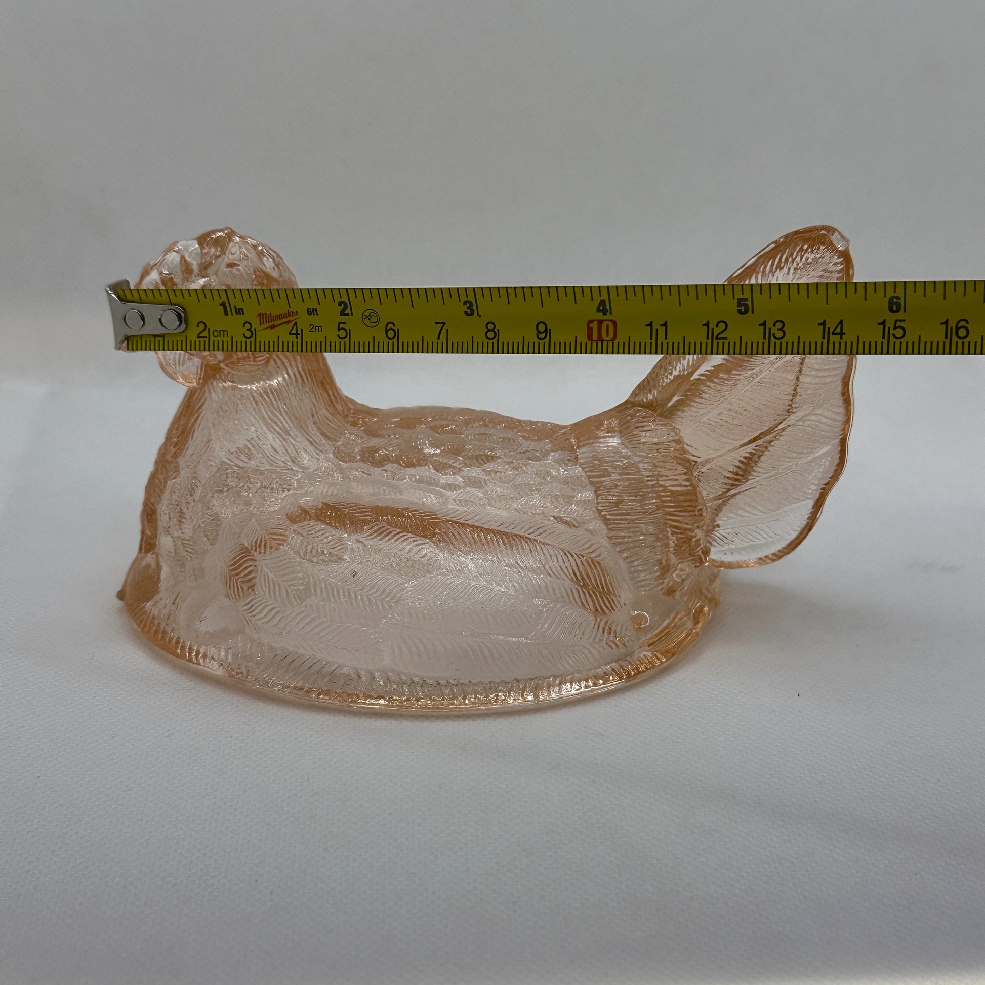 The bottom part of this beautiful “Hen on a Nest" is missing. If you have the the bottom nest, you can add a touch of whimsy to your home with our Iridescent Pink/Peach Hen on The Nest Figurine. This hen has a split tail and a head cocked to the left. Check the measurements carefully to ensure that this will fit your nest.